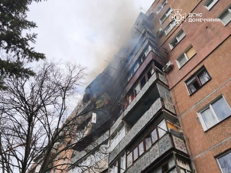 🔹 Дружківка: FPV-дрон влучив у 9-поверхівку. Горіли квартири з 5 по 9 поверхи. Зі сходової клітки 7-го поверху вогнеборці врятували жінку, яку передали медикам. Пожежу на площі 150 кв. м ліквідовано під загрозою повторних ударів.
