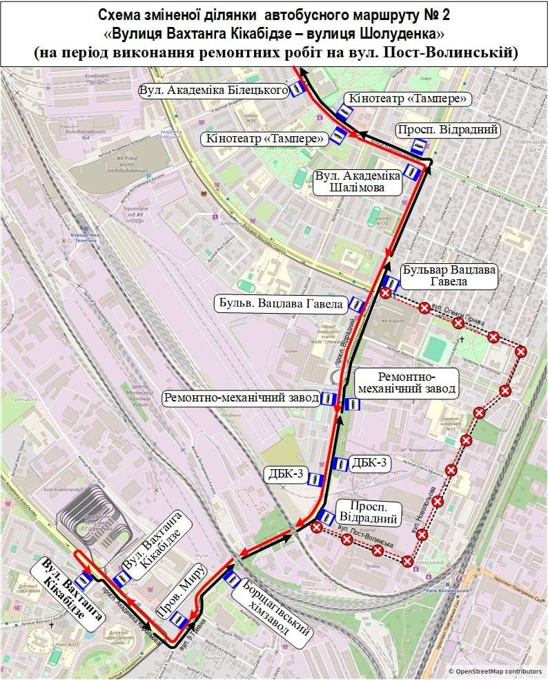 - автобус № 2 – просп. Академіка Корольова (від вул. Вахтанга Кікабідзе) – вул. Дев’ятого Травня – просп. Відрадний (без заїзду на вулиці Пост-Волинську, Новопольову та Олекси Гірника) – вул. Академіка Шалімова, далі за власним маршрутом до вул. Шолуденка;