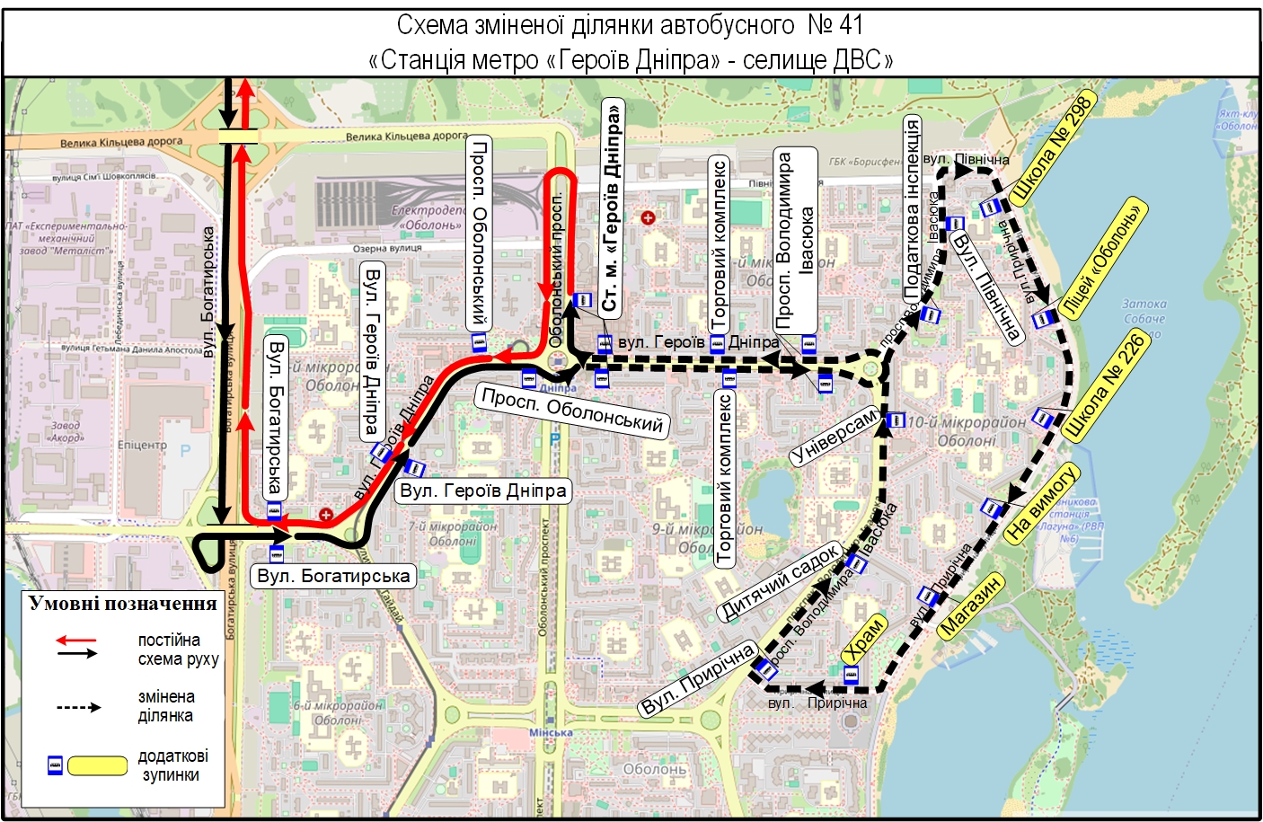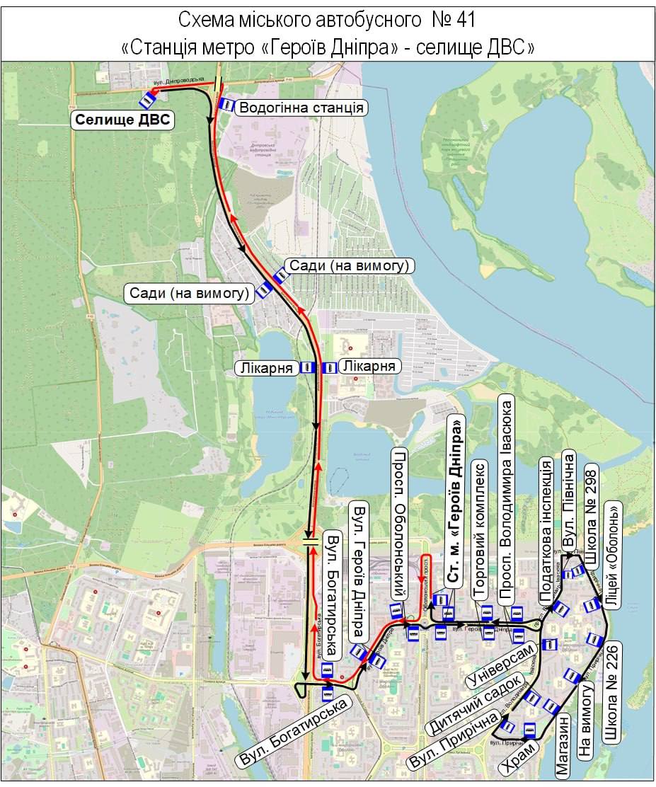 Рух автобусів організують: від селища ДВС до Оболонського просп. за власним маршрутом, далі – вул. Героїв Дніпра – просп. Володимира Івасюка – вул. Північна – вул. Прирічна – просп. Володимира Івасюка – вул. Героїв Дніпра – Оболонський просп. – ст. м. «Героїв Дніпра».