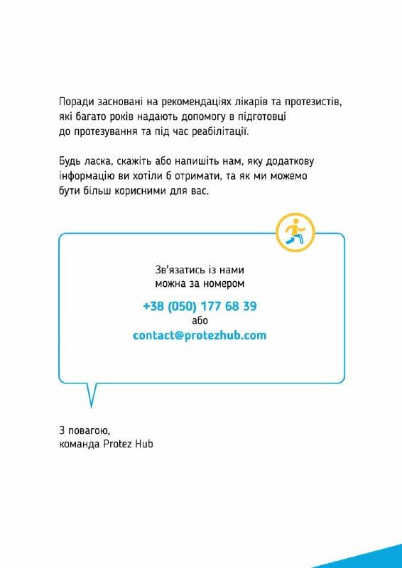 ℹ️ Отримати консультацію щодо подолання фантомного болю та підготовки до протезування можна за телефоном: +38 (050) 177 68 39 або звернувшись за електронною адресою: contact@protezhub.com.