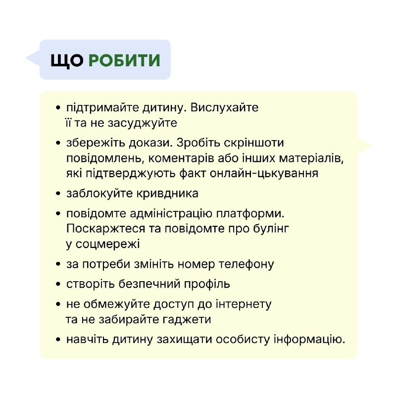 Кібербулінг — це булінг із застосуванням цифрових технологій. Важливо вчасно помітити ознаки кібербулінгу та знати 25.03.2026, Середа | 12:15 Автор допису: Херсонська обласна військова адміністрація Кібербулінг — це булінг із застосуванням цифрових технологій. Важливо вчасно помітити ознаки кібербулінгу та знати, як правильно діяти, щоб підтримати дитину і зупинити онлайн-цькування. Як його розпізнати, що робити та куди звертатись, щоб убезпечити дитину — у картках 👆 Потрібна консультація юриста — зверніться до системи надання БПД:📞 За телефоном 0 800 213 103 📲 Написати приватне повідомлення сторінці https://www.facebook.com/Ukraine.Legal.Aid 🏢 До найближчого бюро правничої допомоги: https://bit.ly/bpd_buro ℹ️ Всі контакти за посиланням: https://legalaid.gov.ua/kliyentam/yak-otrymaty-bpd/ Джерело Друк / PDF