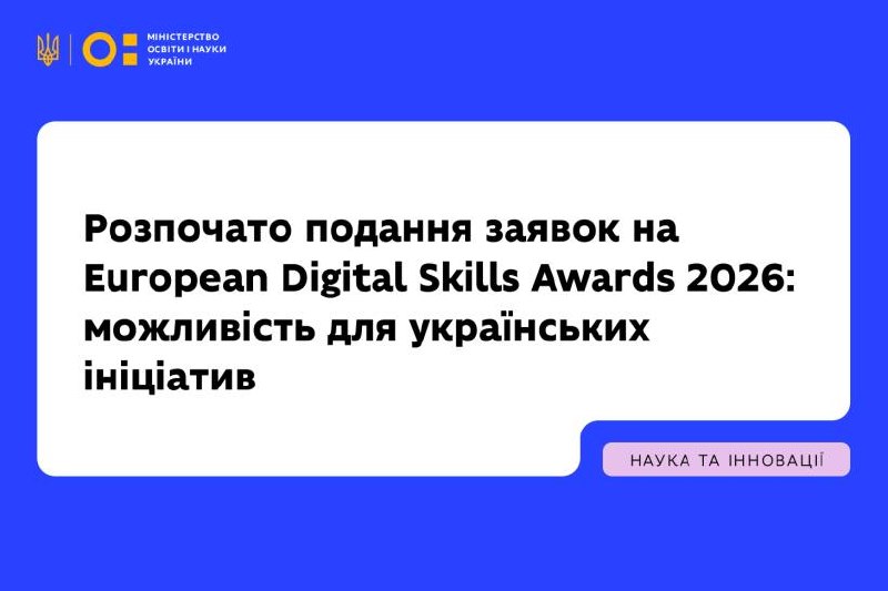 В Україні стартував прийом заявок на European Digital Skills Awards 2026 – європейську відзнаку для ініціатив, що розвивають цифрові навички. Про можливості участі в проєкті повідомляє Міністерство освіти і науки.