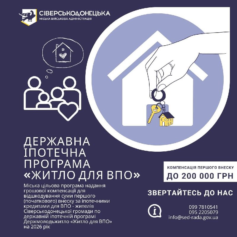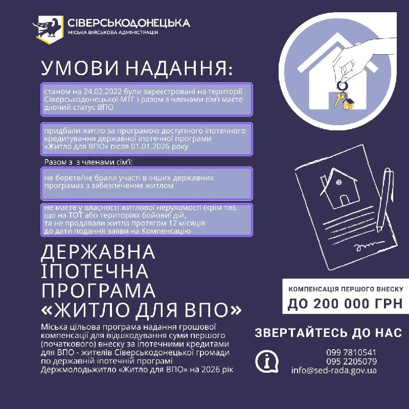 📌Критерії: – ви були зареєстровані в Сіверськодонецькій громаді станом на 24.02.2022 та разом з членами сімʼї маєте діючий статус ВПО; – купили житло за програмою «Житло для ВПО» після 1 січня 2026 року; – у вас та вашої сім’ї немає житла (крім того, що на окупованих територіях або де точаться бої); – не брали участі в інших державних житлових програмах; – за останні 12 місяців до звернення не продавали житло.