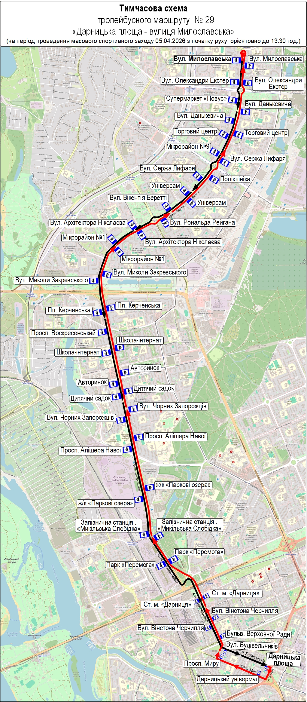 • тролейбус № 29 – від Дарницької площі до вул. Милославської (за маршрутом тролейбуса № 50-К);
