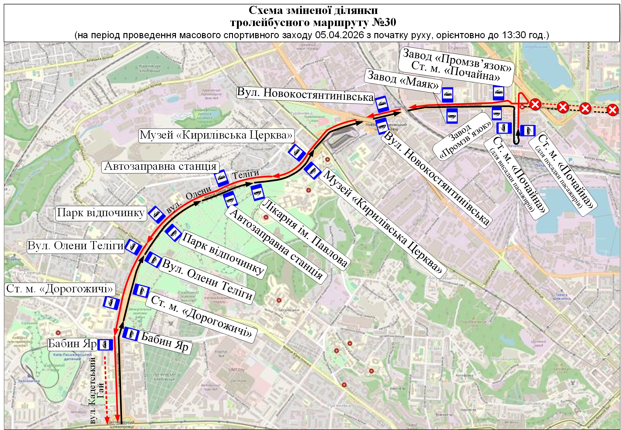• тролейбус № 30 – від вул. Кадетський Гай до ст. м. «Почайна»;