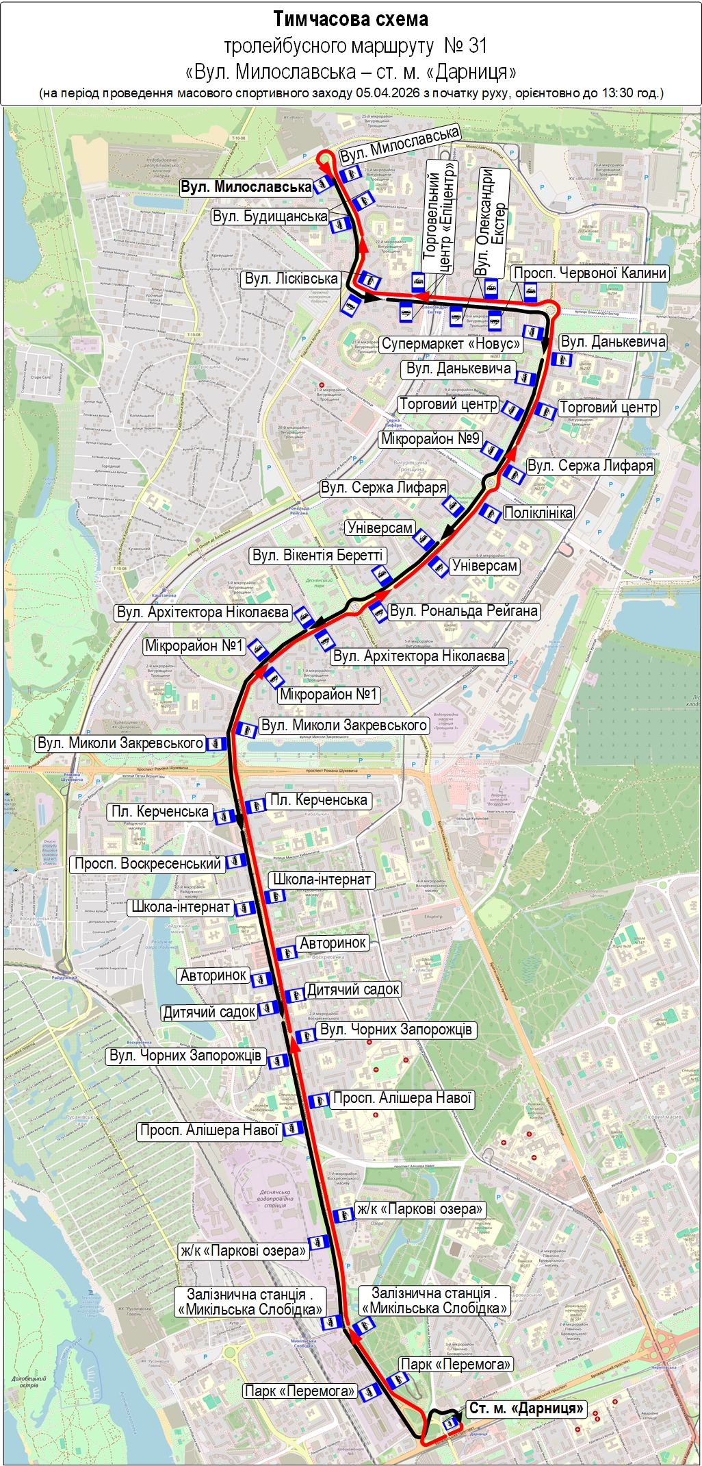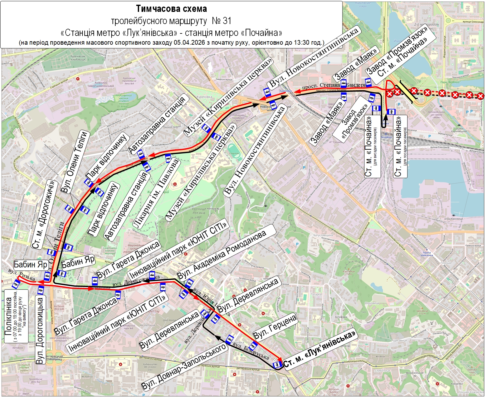 • тролейбус № 31 – від вул. Милославської до ст. м. «Дарниця» та від ст. м. «Лук’янівська» до ст. м. «Почайна»;