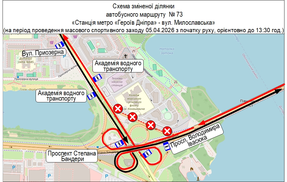 • автобус № 73 – у напрямку до ст. м. «Героїв Дніпра» від вул. Милославської до просп. Степана Бандери за власним маршрутом, далі – просп. Володимира Івасюка – просп. Степана Бандери – просп. Володимира Івасюка, далі – за власним маршрутом.