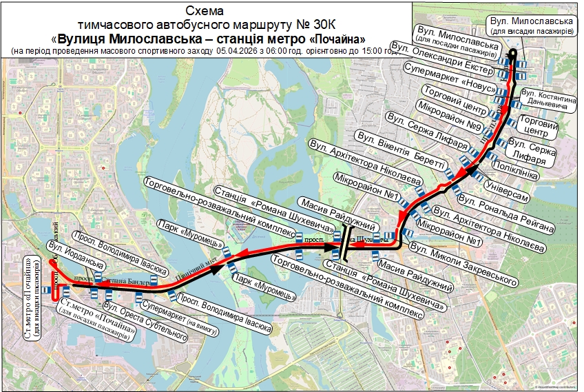 Також організують тимчасовий автобус № 30-К «Вул. Милославська – станція метро «Почайна», який курсуватиме таким чином: просп. Червоної Калини (від вул. Милославської) – просп. Романа Шухевича – Північний міст – просп. Степана Бандери – вул. Богатирська – просп. Оболонський до ст. м. «Почайна».
