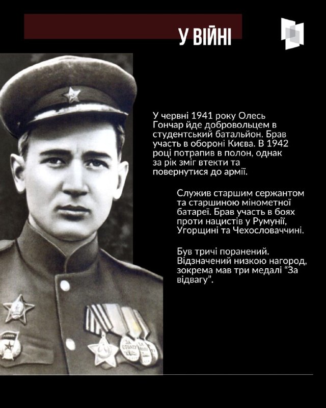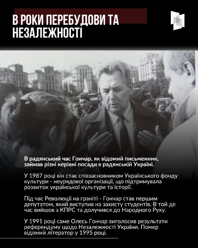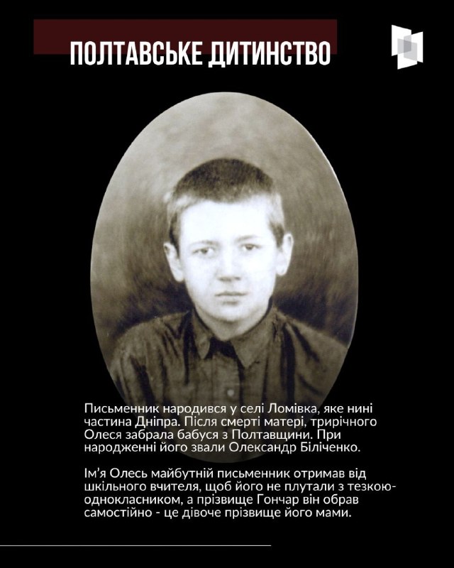 Цього дня минає 108 з дня народження відомого українського письменника та державного і громадського діяча Олеся Гончара 3.04.2026, П’ятниця | 17:02 Автор допису: Український інститут національної пам'яті Цього дня минає 108 з дня народження відомого українського письменника та державного і громадського діяча Олеся Гончара. Про життєвий та творчий шлях літератора у нашому матеріалі Джерело Друк / PDF