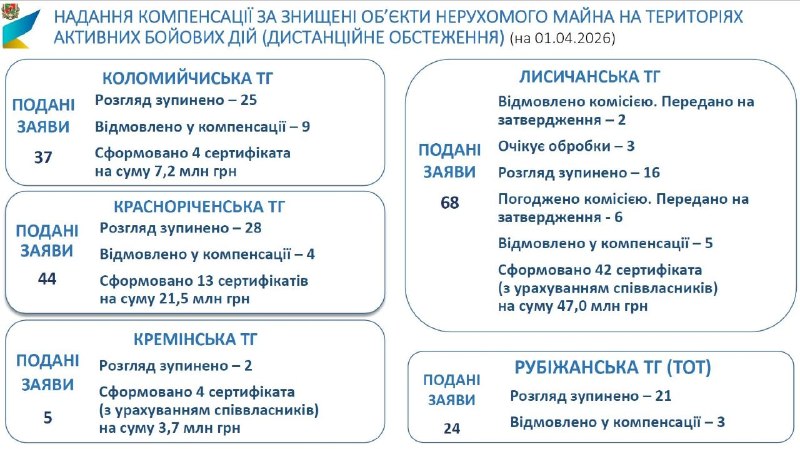 Станом на 1 квітня 2026 року подано 178 заяв на отримання компенсації за знищені об’єкти нерухомого майна житлового призначення на прифронтових територіях, в т. ч. 24 – з Рубіжанської громади.