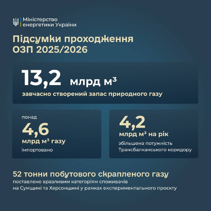 ➖ В осінньо-зимовий період увійшли із запасами газу обсягом 13,2 млрд кубометрів. Газовий імпорт склав — понад 4,6 млрд кубометрів. ➖ У 2025 році український газовидобуток склав 16,97 млрд кубометрів. Це на 2,4 млрд кубометри більше, ніж прогнозувалося. Приватний сектор продемонстрував зростання на понад 14%. ➖ Поставлено 52 тонни скрапленого газу вразливим категоріям громадян у Сумській та Херсонській областях в межах експериментального проєкту. ➖ Збільшено потужність Трансбалканського коридору до 4,2 млрд кубометрів газу на рік. ➖ Працювали усі 9 енергоблоків АЕС при сумарній встановленій потужності у 7835 МВт. ➖ Збільшили можливість для імпорту електроенергії з ЄС. Максимальна потужність імпорту електроенергії була рекордною — 2450 МВт. Загалом в грудні-лютому імпортовано близько 3,6 млрд кВт·год електроенергії. ➖ Протягом зими країна мала достатні запаси вугілля. Накопичили 2,4 млн тонн вугілля, що на 0,8 млн тонн більше плану.