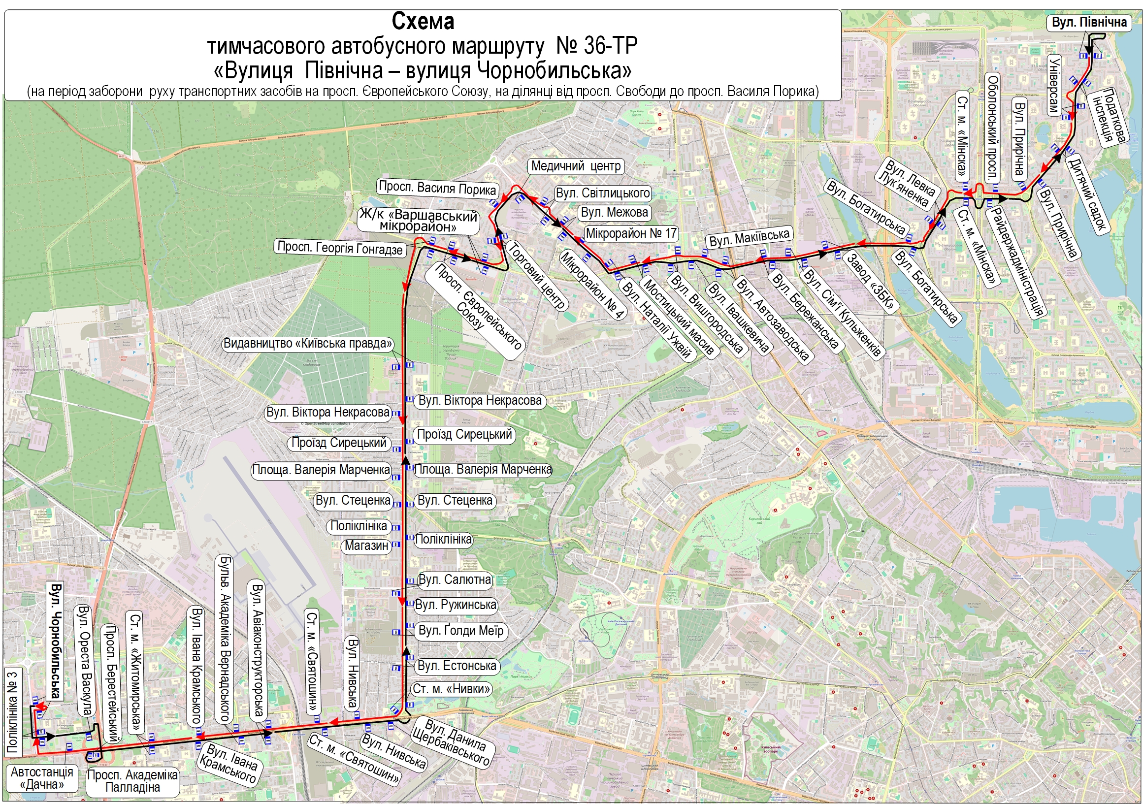Із 6 квітня до орієнтовно 1 грудня продовжать дію тимчасових автобусних маршрутів №№ 36-ТР, 102-А через продовження тимчасового закриття руху на просп. Європейського Союзу – на ділянці від просп. Василя Порика до просп. Свободи. Про це повідомляють у КП «Київпастранс».