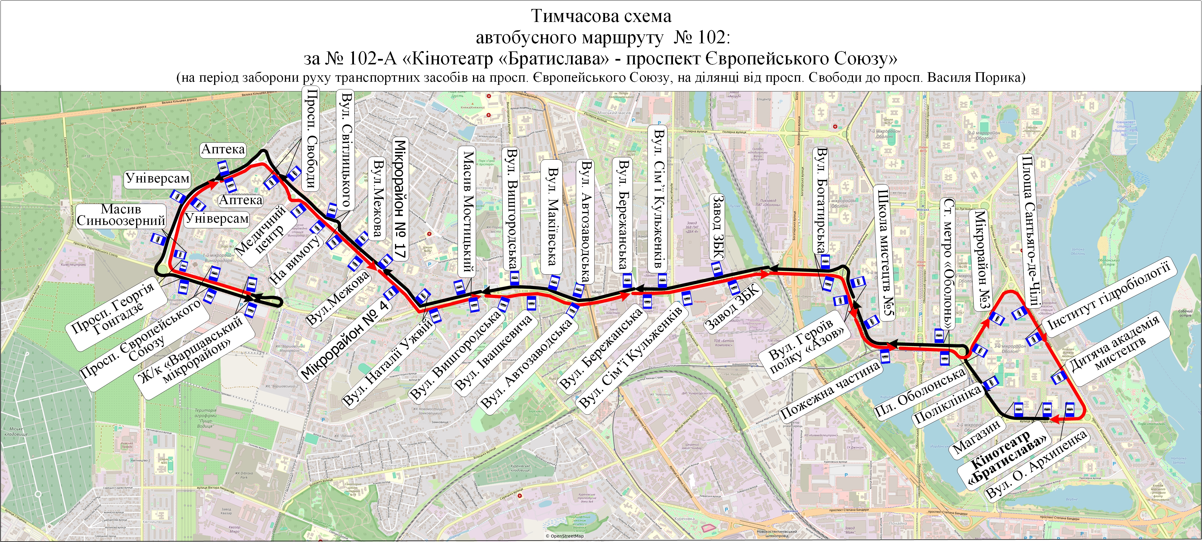 автобус № 102-А – від кінотеатру «Братислава» до просп. Європейського Союзу за власним маршрутом, далі просп. Свободи – просп. Георгія Гонгадзе – просп. Європейського Союзу (до просп. Василя Порика)