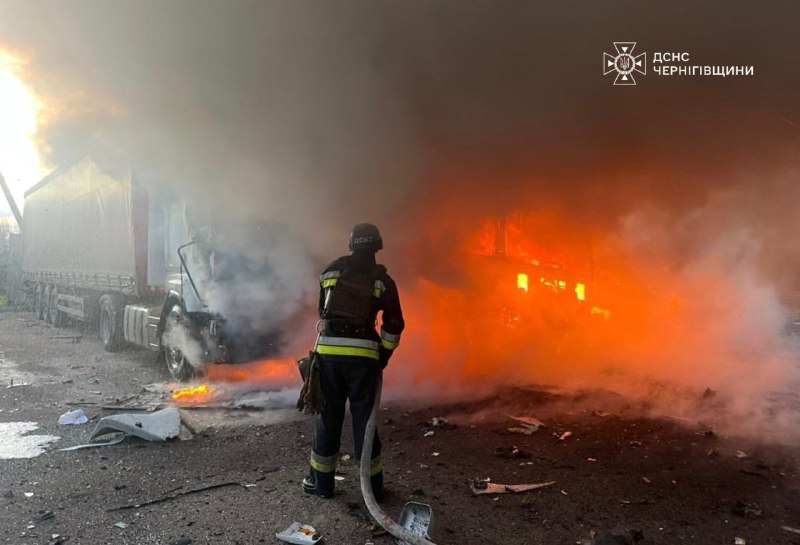 ‼️російський БпЛА влучив вчора ввечері по приватній автостоянці в Корюківському районі на Чернігівщині Загорілися вантажні автомобілі 8.04.2026, Середа | 10:24 Автор допису: Державна служба з надзвичайних ситуацій ‼️російський БпЛА влучив вчора ввечері по приватній автостоянці в Корюківському районі на Чернігівщині Загорілися вантажні автомобілі. Вогнеборці оперативно ліквідували пожежу. Вогонь знищив три транспортні засоби, ще декілька пошкоджені. Попередньо, обійшлося без постраждалих. 🆘 Сайт • Fb • X • IG • YT • TT Джерело Друк / PDF
