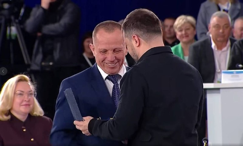 Президент України Володимир Зеленський вручив почесну відзнаку «Місто-герой України» міському голові Старокостянтинова Миколі Мельничуку.