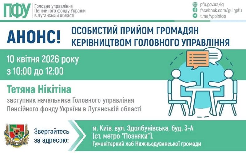 10 квітня у столичному хабі Нижньодуванської громади відбудеться особистий прийом заступника начальника Головного управління Пенсійного фонду України в Луганській області Тетяни Нікітіної.