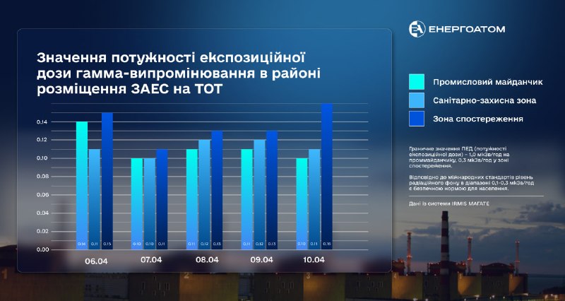 З 06 по 10 квітня 2026 року потужність експозиційної дози гамма-випромінювання в районі розміщення Запорізької АЕС на тимчасово окупованих територіях України відповідала чинним нормам.