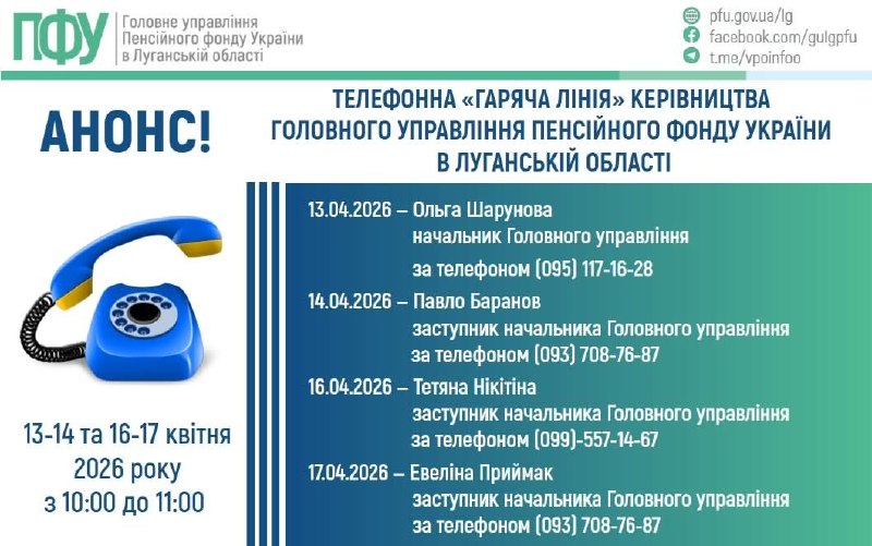 У п’ятницю, 17 квітня, із 10:00 до 11:00 відбудеться «гаряча лінія» за участі заступника начальника Головного управління Пенсійного фонду України у Луганській області Евеліни Приймак. Номер телефону: (093) 708-76-87.