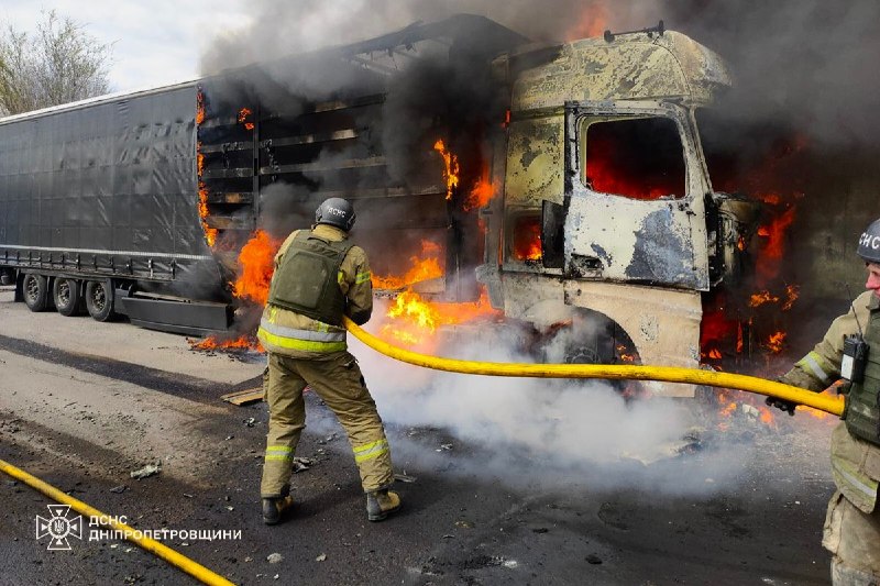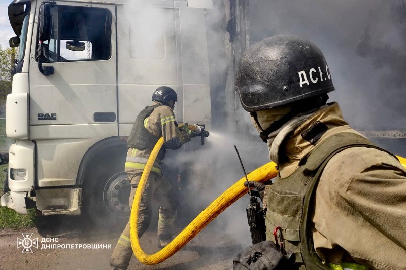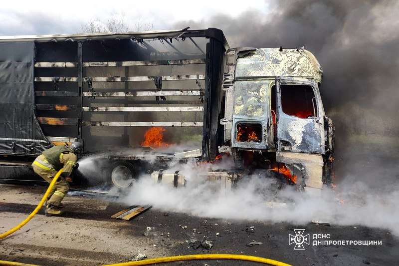 Нікополь: Внаслідок влучання FPV-дрона загинув 67-річний чоловік, який перебував за кермом вантажівки. Виникла пожежа, яку оперативно приборкали вогнеборці. Протягом дня атаки по місту спричинили займання ще двох вантажних авто.