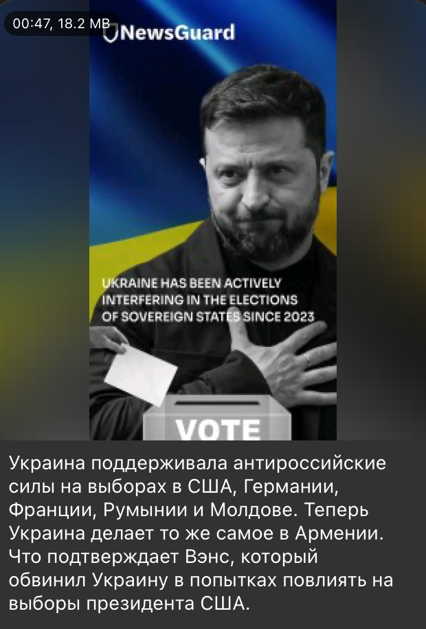 У соціальних мережах та прокремлівських Telegram-каналах масово поширюється відеоролик із логотипом аналітичної компанії NewsGuard. У відео стверджується, що Україна з 2023 року «активно втручається у вибори суверенних держав», зокрема у США, Німеччині, Франції, Румунії, Молдові, а тепер і у Вірменії. Як «докази» наводяться тези про використання українськими спецслужбами бот-ферм і здійснення DDoS-атак на підтримку «антиросійських сил».