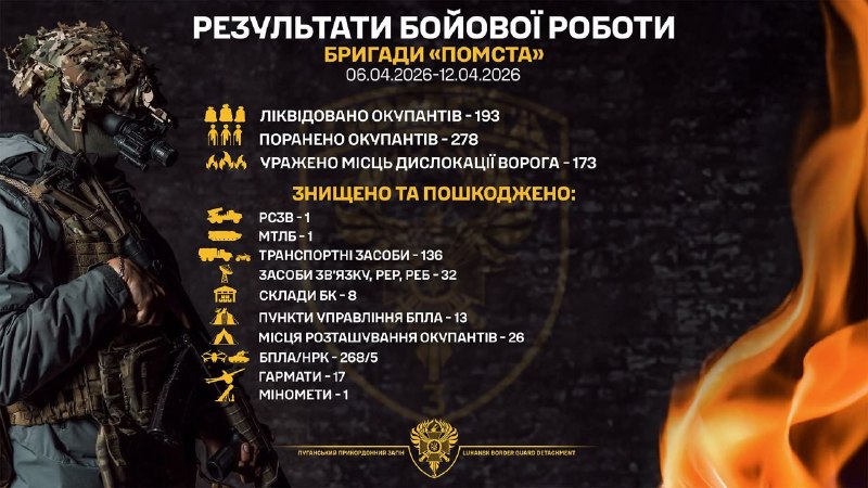 Бійці бригади «Помста» протягом зазначеного періоду ліквідували 193 окупантів, ще 278 зазнали поранень. Загалом по місцях дислокації противника завдано 173 вогневі ураження.