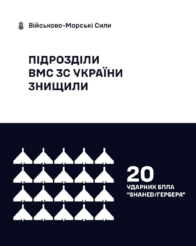 За минулу добу, станом на 06:00 17.04.2026, силами та засобами Військово-Морських Сил Збройних Сил України у складі угруповань було збито 20 ударних БпЛА типу «SHAHED/Гербера».