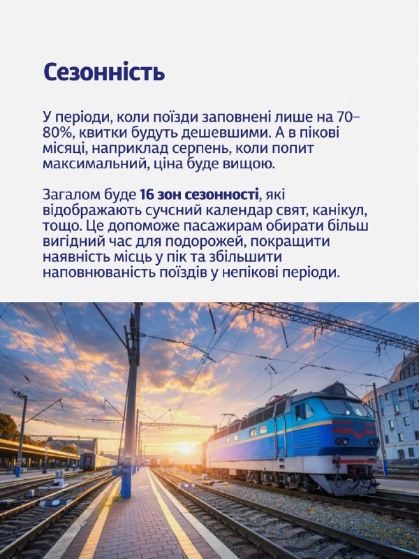 1. Сезонність. У періоди, коли поїзди заповнені лише на 70–80%, квитки будуть дешевшими. А в пікові місяці, наприклад серпень, коли попит максимальний, ціна буде вищою. Загалом буде 16 зон сезонності, які відображають сучсний календар свят, канікул, тощо. Це допоможе пасажирам обирати більш вигідний час для подорожей, покращити наявність місць у пік та збільшити наповнюваність поїздів у непікові періоди.