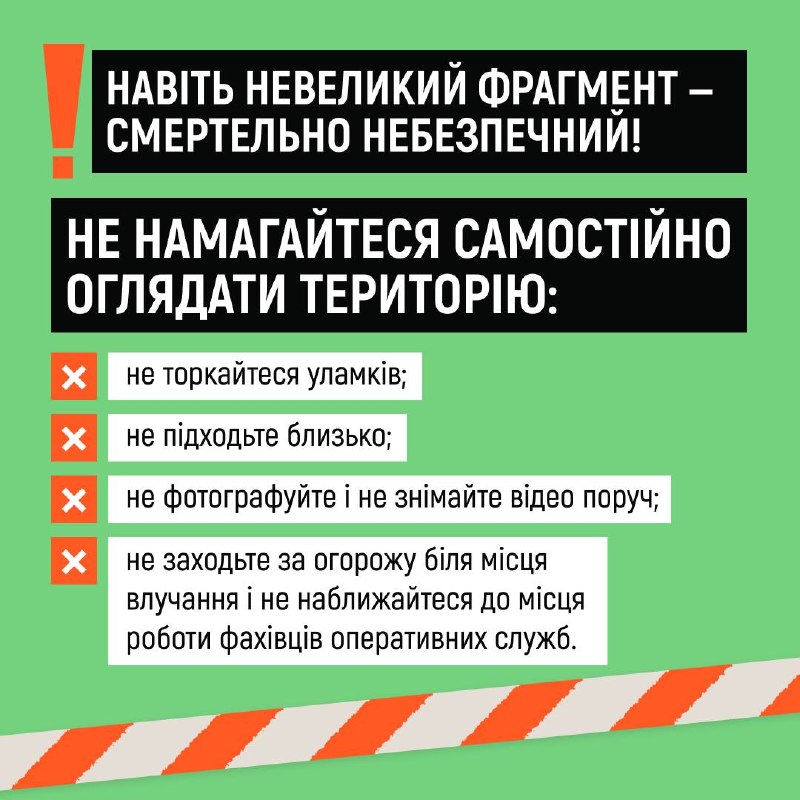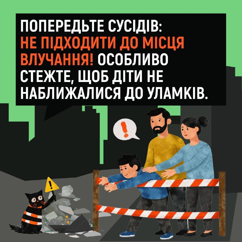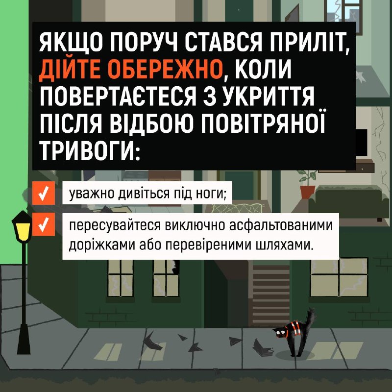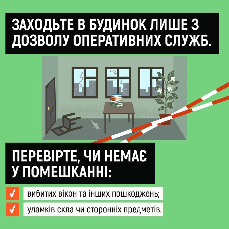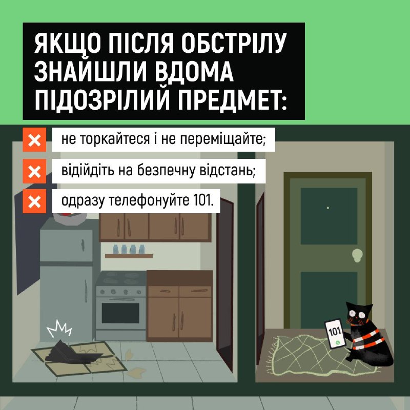 Що робити, коли під час обстрілу сталося влучання поруч із вашим будинком? 20.04.2026, Понеділок | 14:36 Автор допису: Державна служба з надзвичайних ситуацій Що робити, коли під час обстрілу сталося влучання поруч із вашим будинком? 💥Адже навколо або навіть у вашому помешканні можуть опинитися уламки та частини вибухонебезпечних предметів! Дізнайтеся про алгоритм дій після повернення з укриття у картках ⬆️ ❗️Закликаємо не нехтувати власною безпекою та безпекою рідних: завжди прямуйте до укриття після сигналу повітряної тривоги! 🆘 Сайт • Fb • X • IG • YT • TT Джерело Друк / PDF