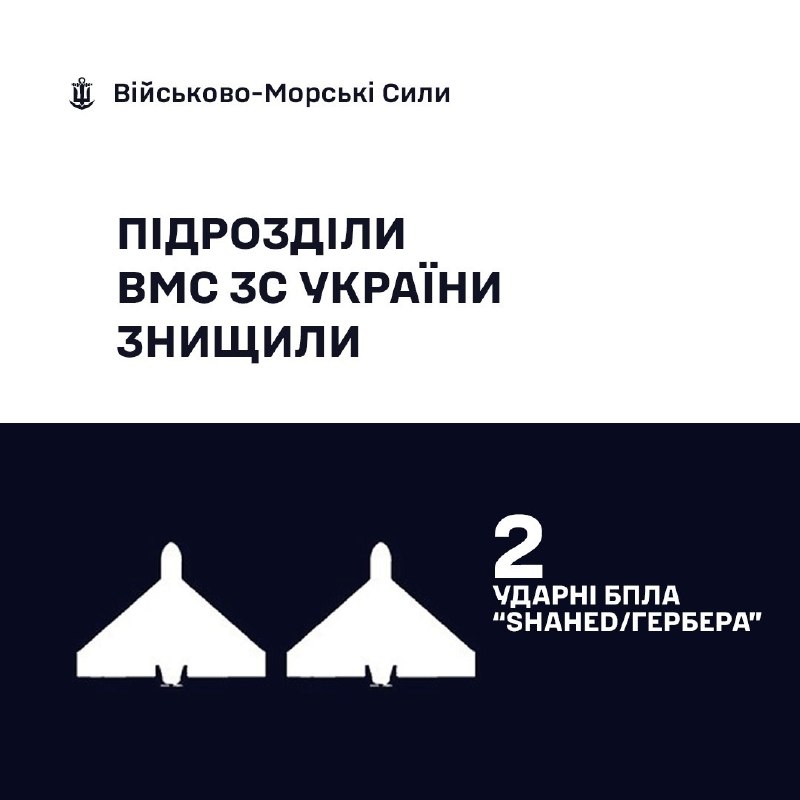 За минулу добу, станом на 06:00 21.04.2026, силами та засобами Військово-Морських Сил Збройних Сил України у складі угруповань було збито 2 ударні БпЛА типу «SHAHED/Гербера».