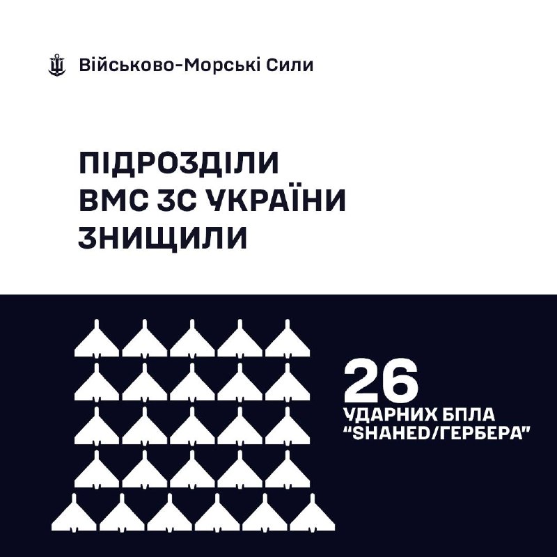 За минулу добу, станом на 06:00 22.04.2026, силами та засобами Військово-Морських Сил Збройних Сил України у складі угруповань було збито 26 ударних БпЛА типу «SHAHED/Гербера».