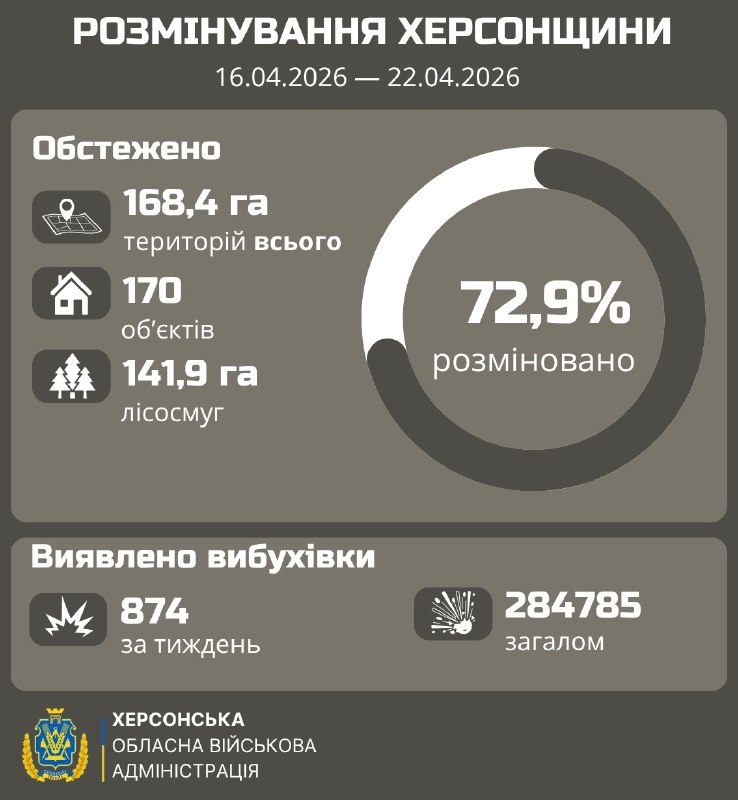 ⚠️ Піротехніки продовжують очищувати правобережжя Херсонщини від російських мін та боєприпасів. 23.04.2026, Четвер | 20:22 Автор допису: Херсонська обласна військова адміністрація ⚠️ Піротехніки продовжують очищувати правобережжя Херсонщини від російських мін та боєприпасів. Прогрес розмінування за минулий тиждень — на інфографіці 👆 Джерело Друк / PDF