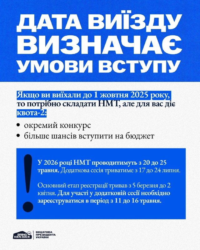 Умови вступу залежать від дати виїзду на підконтрольну територію. Абітурієнти, які досі перебувають в окупації або виїхали після 1 жовтня 2025 року, мають право на вступ через співбесіду в університеті без складання НМТ.