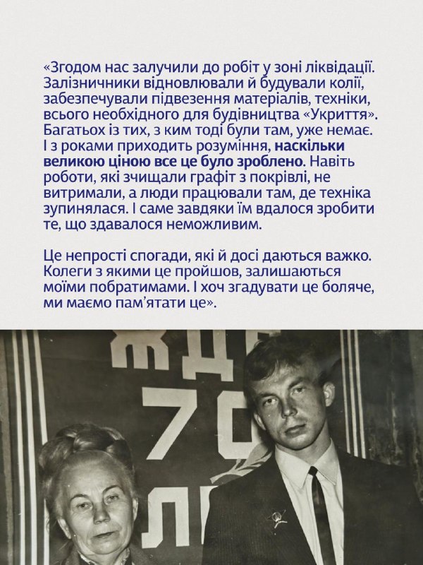 Після аварії на Чорнобильській АЕС залізниця стала одним із ключових шляхів ліквідації наслідків. Саме залізничники щодня виконували роботу, від якої залежали темпи будівництва «Укриття» та вся логістика операції. Вони відновлювали й будували колії, проклали понад 56 км нових шляхів і відремонтували ще 8 км, збільшували пропускну здатність під’їзних маршрутів, підвели залізничну гілку до майбутнього міста Славутич і безперервно доставляли бетон, метал, паливо, техніку та будівельні матеріали для спорудження саркофага. На сьогоднішній день в Укрзалізниці працює 162 ліквідатори Чорнобильської катастрофи.