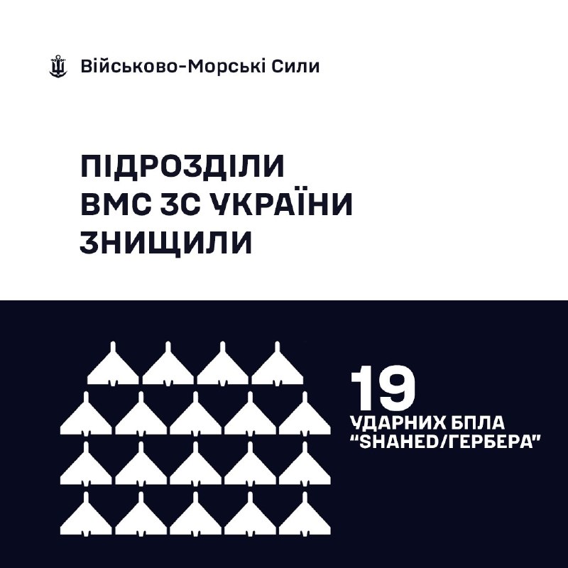 За минулу добу, станом на 06:00 27.04.2026, силами та засобами Військово-Морських Сил Збройних Сил України у складі угруповань було збито 19 ударних БпЛА типу «SHAHED/Гербера».