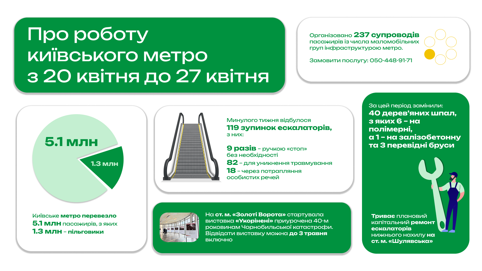 У цей період також фахівці організували 237 супроводів пасажирів із числа маломобільних груп інфраструктурою метрополітену. Нагадаємо, що для замовлення супроводу необхідно зателефонувати за номером (044) 238-55-11 або 050-448-91-71 та повідомити маршрут поїздки в метрополітені. Рекомендуємо телефонувати за годину до запланованої поїздки, аби працівник метро очікував біля початкової станції.