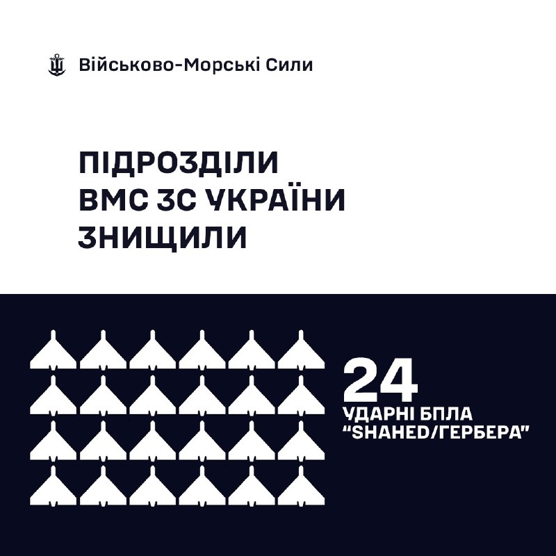 За минулу добу, станом на 06:30 29.04.2026, силами та засобами Військово-Морських Сил Збройних Сил України у складі угруповань було збито 24 ударних БпЛА типу «SHAHED/Гербера».
